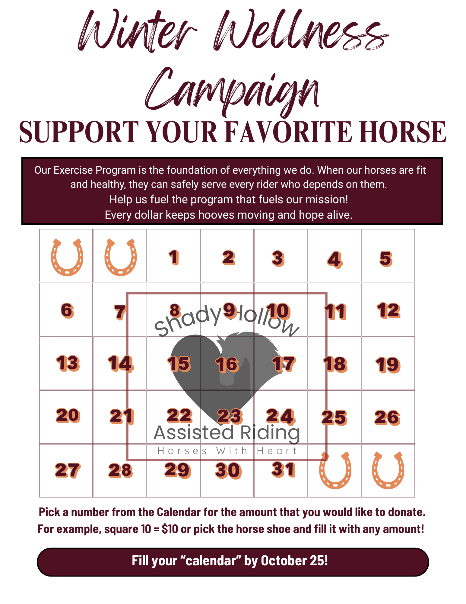 We are raising funds to help support the horses throughout the winter. Lessons slow down, which means the horses don’t get the proper exercise needed to sustain healthy muscle tone. With the careful guidance of our certified equine trainer, our staff and volunteers help to ensure that our horses stay in shape over the winter. To keep the horses in good weight and conditioning, increase hay and supplements are also required during those harsh winter days and freezing nights.